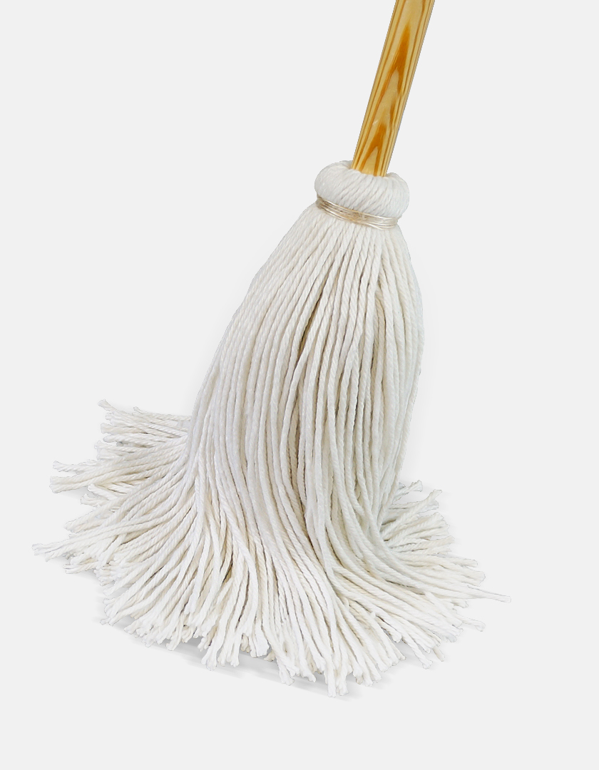 - A one-piece utility mop with the yarn being securely fastened to the handle with synthetic wrapping twine to prevent rust